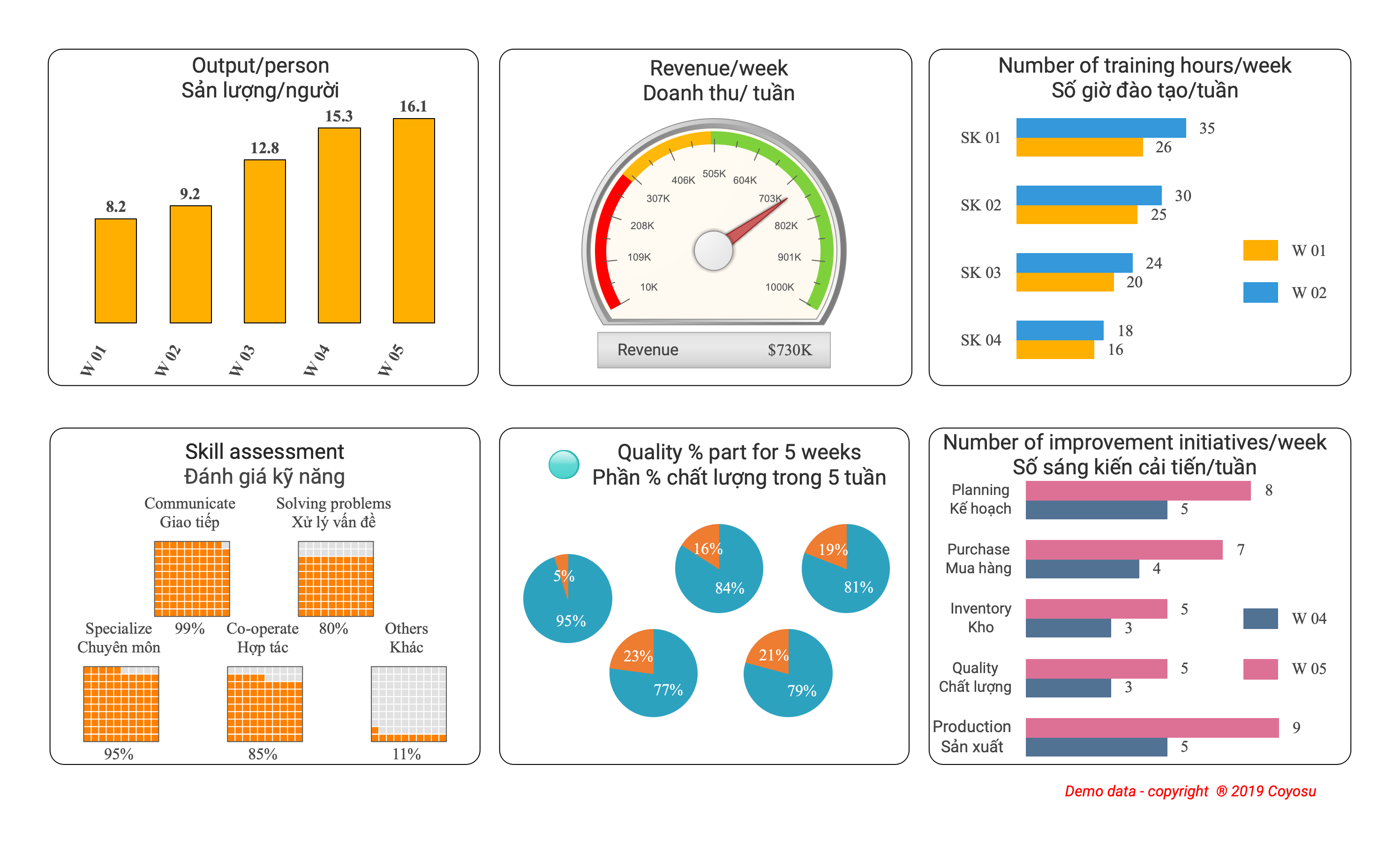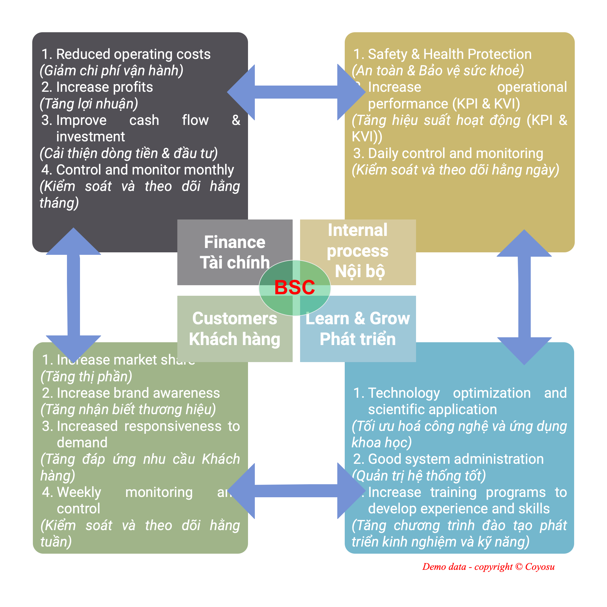 In order to successfully apply KPI/KVI to bring efficiency every day, businesses need scientific operating methods (a set of scientific management tools to help businesses break the iceberg to move forward). ), qualified human resources and good system administration. COYOSU's KPI/KVI/BSC implementation method is always based on the internal reality of the business and upgrades the system according to the customer's business development strategy.